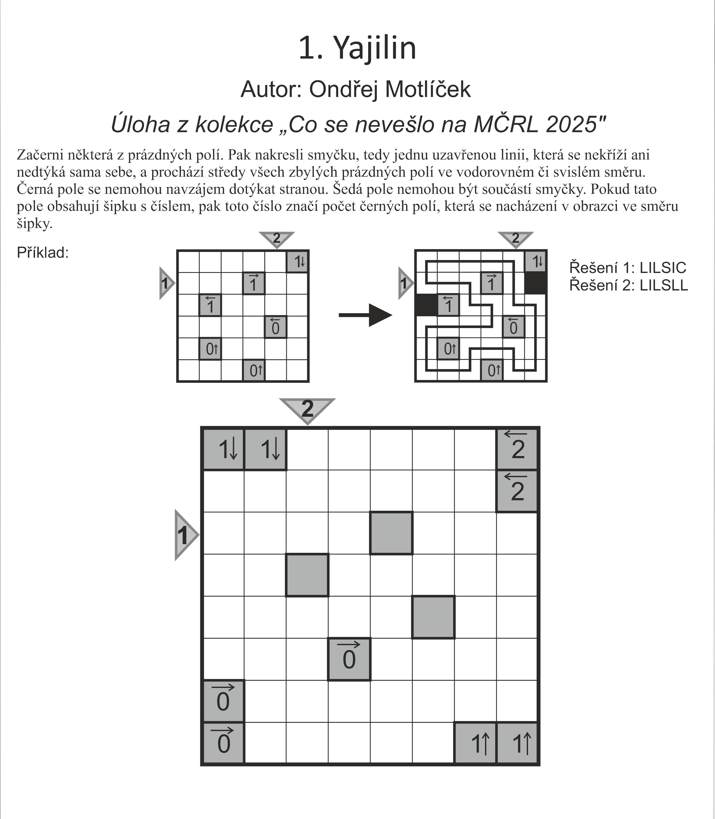 Řešení 1: Vypište obsah 3. řádku. Prochází-li polem smyčka přímo, použijte I, pokud se smyčka v poli lomí, použijte L, pro černá pole použijte C a pro šedá S.