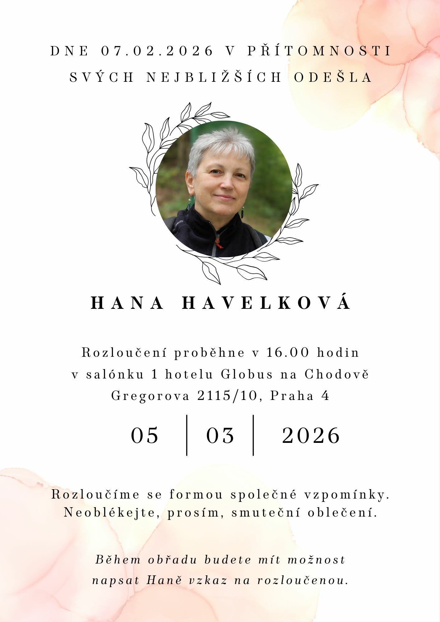 Dle jejího přání se uskuteční neformální setkání rodiny a přátel ve čtvrtek 5. března.